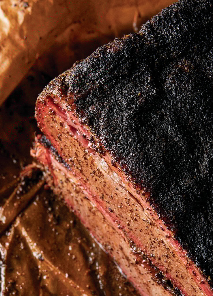 En el barbecue texano, el protagonista indiscutible es el brisket (pecho de res), cocinado durante horas en ahumadores alimentados generalmente con madera de roble o post oak. A diferencia de otros estilos, el sazonado suele ser mínimo, a menudo sólo sal y pimienta, para dejar que el sabor de la carne y el humo se expresen plenamente.