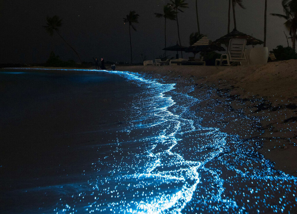 Cuando el sol se esconde, el mar cobra vida de una forma diferente. En Cozumel se pueden hacer inmersiones nocturnas en las cuales las linternas revelan morenas, pulpos y tortugas en su hábitat más tranquilo. En la bahía Mosquito (Puerto Rico) y en Holbox, el fenómeno de la bioluminiscencia convierte el mar en un espejo de luz cada vez que mueves la mano. También se puede vivir algo parecido en las Maldivas o Tailandia, donde las aguas se iluminan con tonos de azul neón, lo que se combina con la aparición de mantarrayas con las que puedes nadar y que convierte esto en un momento de conexión profunda con la naturaleza.