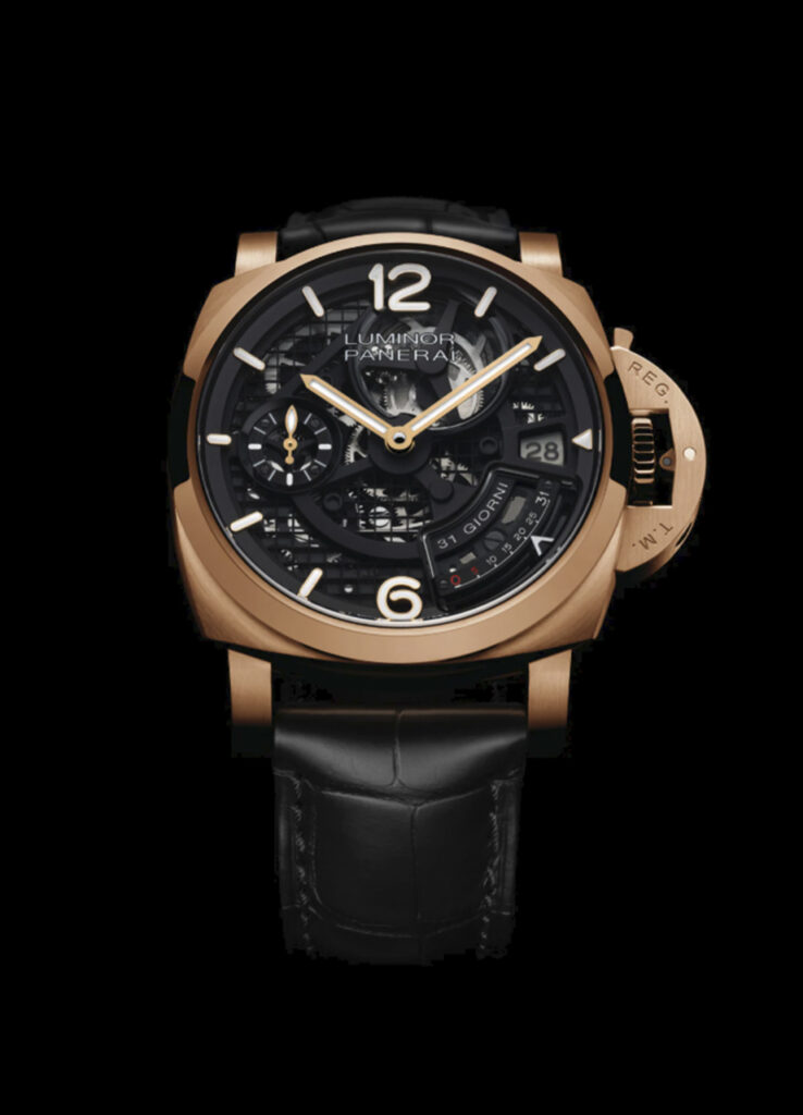 La esfera es esqueletizada, lo que permite ver ese movimiento desde el frente, y cuenta con un indicador de reserva de marcha, fecha con disco polarizado patentado y segundos pequeños a las 9. Hay 200 piezas en total, a un precio de $107,000 dólares, disponibles exclusivamente en boutiques Panerai.