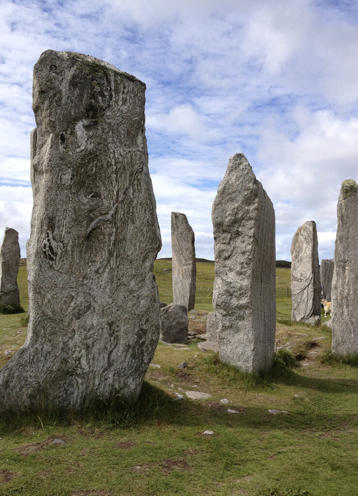 Las piedras de Calanais fueron creadas entre el 2,900 y el 2,600 a.C., lo que las coloca en una cronología similar, e incluso anterior, a Stonehenge. No se trata de un solo círculo, sino de un diseño más complejo: un eje central con una disposición en cruz, acompañado por avenidas de monolitos que se extienden en distintas direcciones.